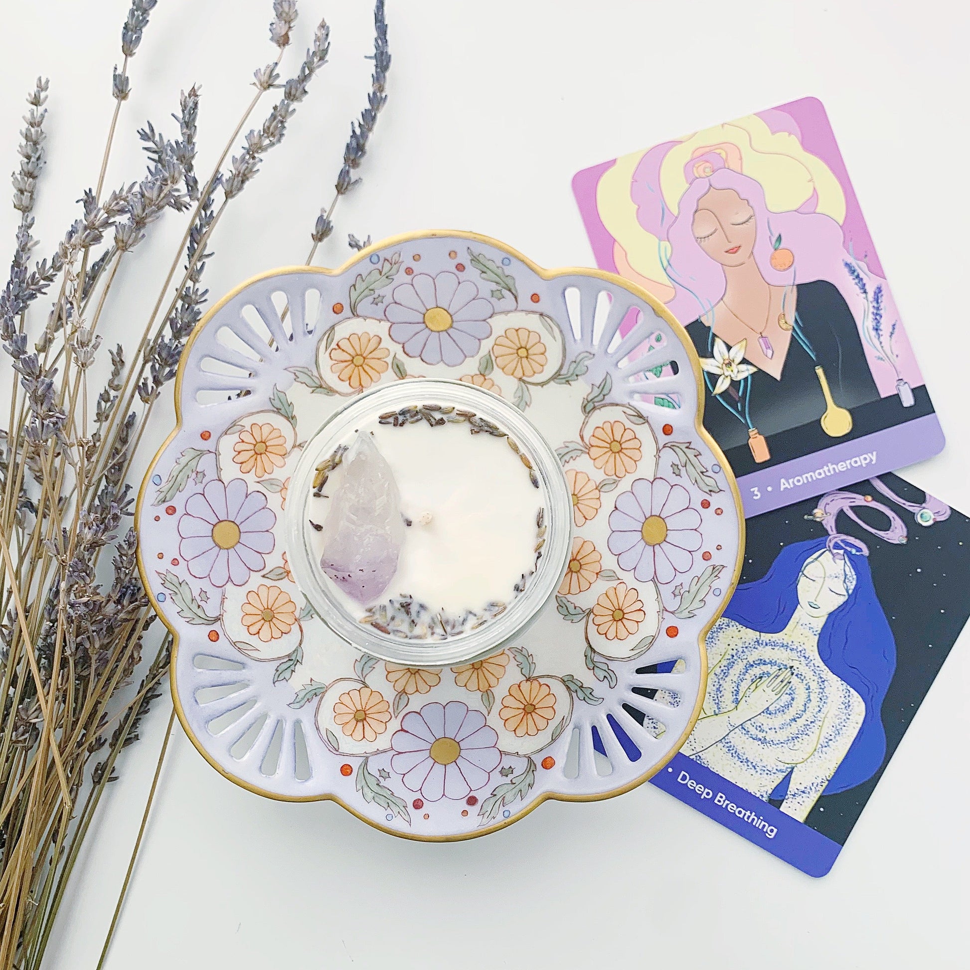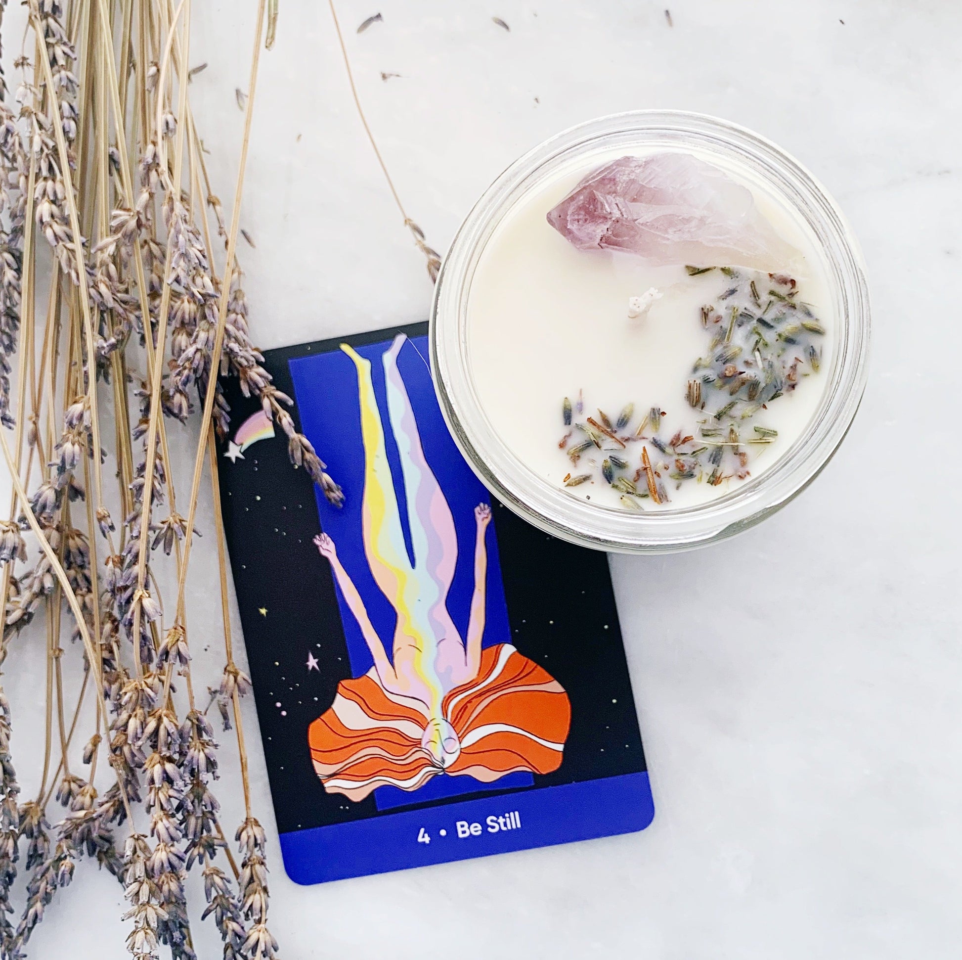 Instantly manifest calm, soothing vibes with this heavenly combination of buttery vanilla and fields of lavender swaying softly in a breeze. This hand-poured soy candle features organic lavender buds and an amethyst crystal, blessed under a full moon to help you let go of anxieties, negative energy, and addictions, and tap into your inner wisdom. A calming mantra is included on the label of the candle to help you focus your energy on relaxing. 💜