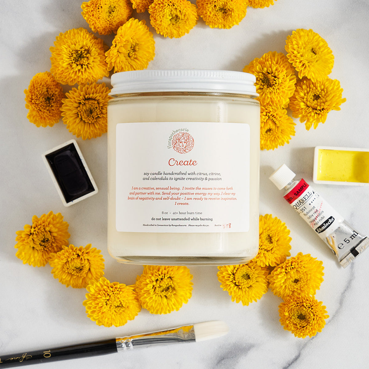 Uplifting citrus with a dash of sultry amber meet calendula and citrine in this hand-poured soy candle to inspire creativity, confidence, and passion. The citrine crystal was blessed under a full moon to help you ignite your inner fire and give you the courage to unleash your creative gifts, wisdom, and sensuality. Get it, girl! An inspiring mantra is included on the label of the candle to help focus your energy. 💛✨