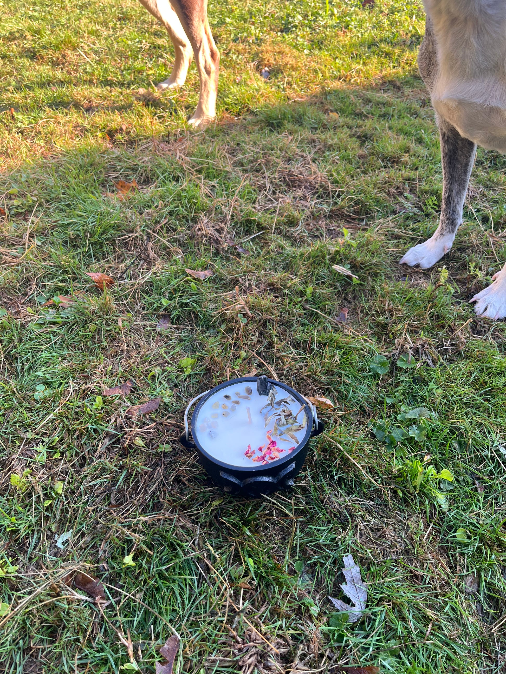 This is a big 16oz soy candle hand-poured into a cast iron cauldron, which can be cleaned and reused. See candle sizes for reference in image 4. The cauldron also comes with a lid (see image 3). Burn time: approximately 50+ hours. Cauldron measures approximately 4.75" at the widest by 4.75" deep, with an opening of 4" wide. It is about 4.5" tall with the legs, and the opening is about 3" deep.