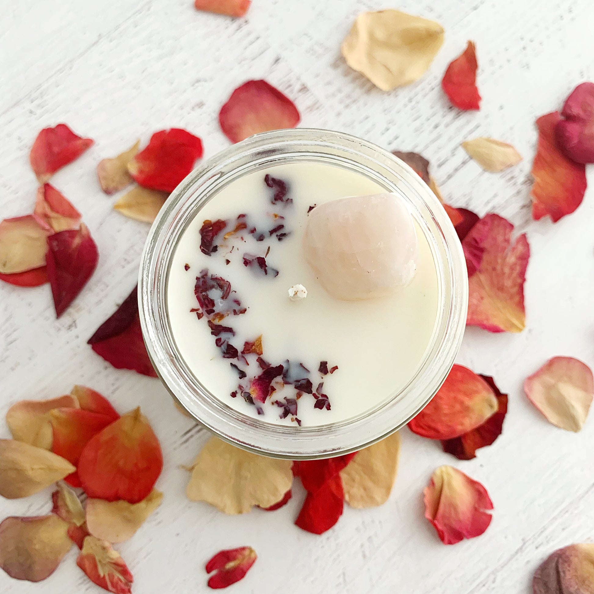 Love, love, love. This hand-poured soy candle is blended with rose petals and topped with a rose quartz, the stone for universal love and harmony, blessed under a full moon to help you manifest compassion, love for yourself, and love for others. The rosy scent is truly hard to describe, but a must for anyone who loves rose even a little bit. Not your grandma's too-sweet perfume, this scent is more like a rose milk bath or a fancy Italian rose gelato. Bellissimo! You are love, and you are loved. 💖